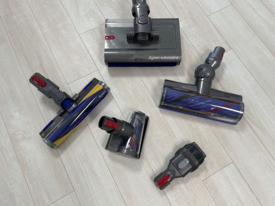 With the multiple heads that come with the Dyson V12s Detect Slim Submarine, customized cleaning for different situations was possible. The 'Fluffy Optic Cleaner Head,' which shines a green light in front of the head to reveal hair and dust on the floor, allowed for thorough cleaning even in hard-to-see places like beds and sofas. Also, the 'Hair Screw Tool' with a spiral brush bar made it easy to clean floors with a lot of hair, such as in front of the dressing table and bathroom. Unlike regular heads, this function sucks hair into the dustbin without tangling.