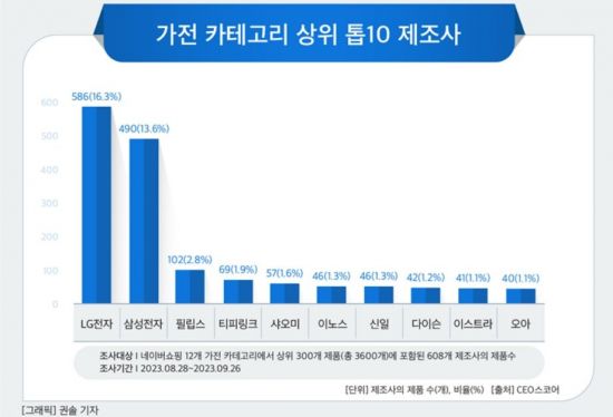 On the 25th, CEO Score, a corporate data research institute, announced that among a total of 3,600 products across 12 categories in the 'Naver Shopping Ranking Top 300' for the home appliance sector on Naver Shopping from August 28 to September 26, LG Electronics had the highest number with 586 products.