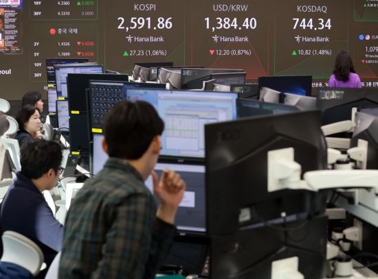 Following the U.S. Federal Reserve's interest rate cut, the U.S. S&P 500 and Nasdaq indices hit record highs for two consecutive days, and on the 8th, the domestic stock market also started on an upward trend. The KOSPI opened 22.07 points higher at 2586.70 points, and the KOSDAQ also started with gains. The USD/KRW exchange rate fell by more than 10 won. Various indices are displayed in the dealing room of Hana Bank in Euljiro, Seoul.