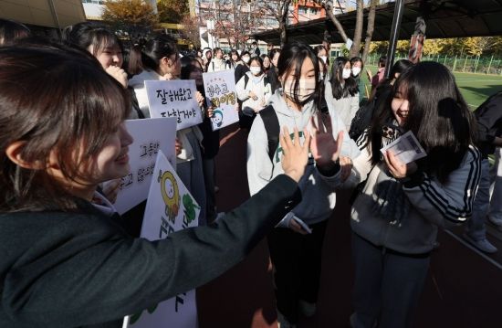 On the 13th, one day before the 2025 College Scholastic Ability Test (CSAT), students at Seongsu High School in Seongdong-gu, Seoul, are cheering for their seniors' success in the exam.