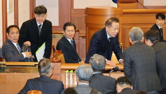 Jung Cheong-rae, the head of the National Assembly's impeachment prosecution team and chairman of the Legislation and Judiciary Committee, along with the legal representatives, are attending and conversing at the first preparatory hearing for President Yoon Seok-yeol's impeachment trial held on the 27th at the small courtroom of the Constitutional Court in Jongno-gu, Seoul.
