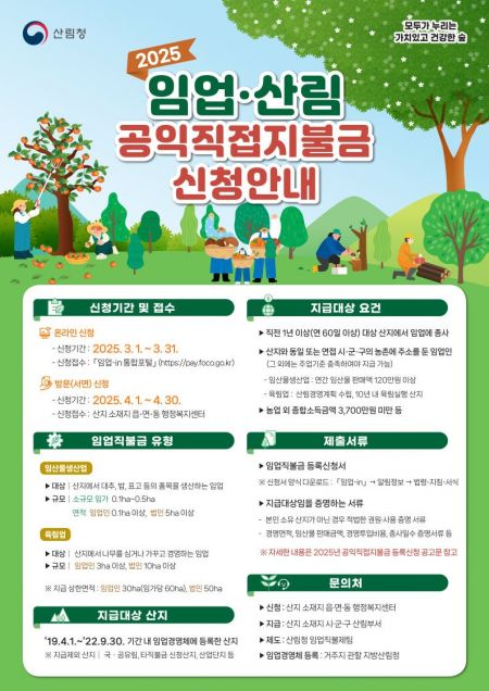 The Korea Forest Service announced on the 18th that it will accept applications for the "2025 Forestry and Forest Public Interest Direct Payment (hereinafter referred to as Forestry Direct Payment)" from April 1 to April 30.