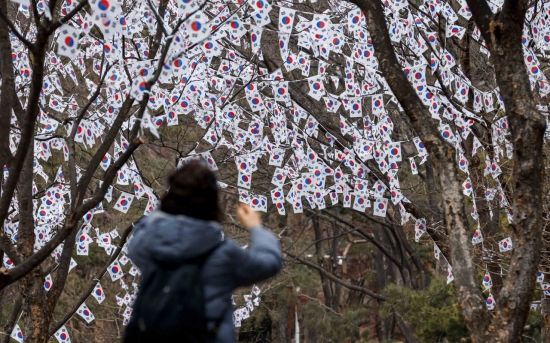 On the 28th, a day before the 106th anniversary of the March 1st Movement, the Taegeukgi flag is hanging on a tree branch near Hyochang Park in Yongsan-gu, Seoul.