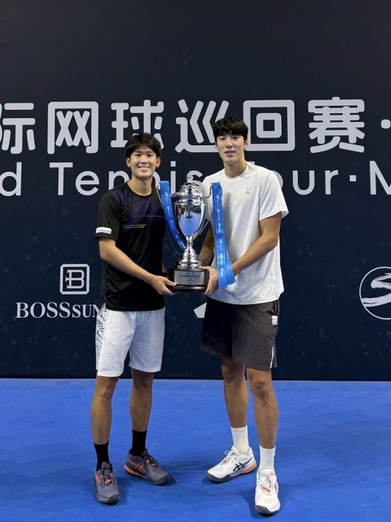 Jung Young-seok (right), who won the men's doubles title at the 'ITF Maanshan International Tour Tournament' held in Maanshan, China. Provided by Uijeongbu City