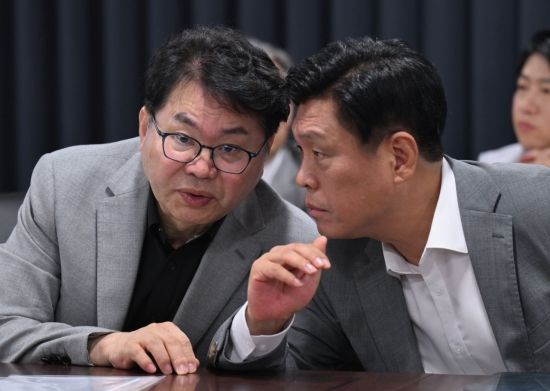 Han Joo Lee, Chairman of the National Policy Planning Committee (left in the photo), and Seungrae Cho, spokesperson of the National Policy Committee, are talking during the prosecution office work report held at the Changseong-dong annex of the Government Seoul Office in Jongno-gu, Seoul, on the morning of the 20th. Photo by Yongjun Cho