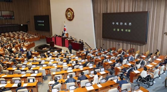 Shin Dongwook, a member of the People Power Party, is conducting an unlimited debate (filibuster) related to the submission of the "Broadcasting Three Acts (Amendments to the Broadcasting Act, Broadcasting Culture Promotion Agency Act, and Korea Educational Broadcasting System Act)" at the plenary session held at the National Assembly on the 4th. Photo by Kim Hyunmin