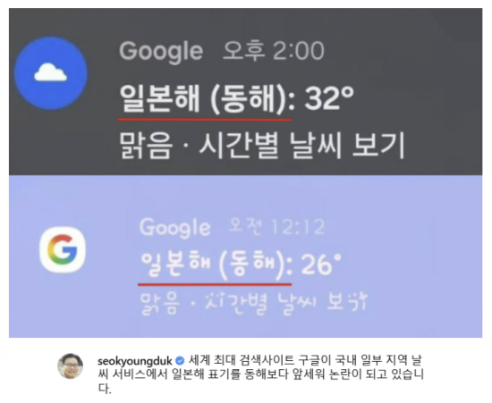 Seo Kyungduk, a professor at Sungshin Women's University, stated on his social media account on August 7, "I learned about this issue thanks to numerous reports from internet users during the recent vacation season," adding, "People who traveled to the East Coast for vacation discovered the 'Sea of Japan (East Sea)' label in Google's weather alert service."