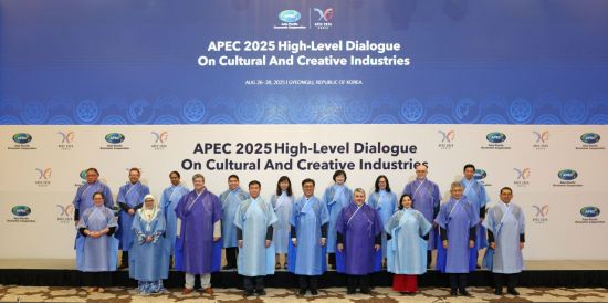 Participants of the Asia-Pacific Economic Cooperation (APEC) 2025 High-Level Dialogue on Cultural Industries are taking a commemorative photo wearing hanbok after concluding the plenary session at the Hilton Hotel in Gyeongju, Gyeongsangbuk-do on the 27th. The Ministry of Culture, Sports and Tourism announced that 20 of the 21 APEC member economies attended the meeting, excluding Mexico. [Photo by Ministry of Culture, Sports and Tourism]