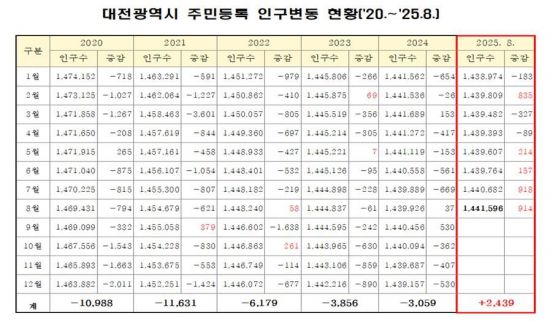 This marks a clear turnaround from the population decline that had persisted since 2013, with a distinct upward trend emerging this year. Notably, Daejeon has recorded a net influx of residents for four consecutive months since May, signaling a turning point in population growth.