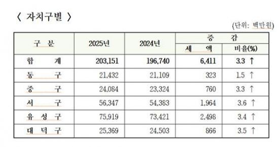 By district, property tax assessments were as follows: Yuseong-gu, 75.9 billion won (up 3.4%); Seo-gu, 56.4 billion won (up 3.6%); Daedeok-gu, 25.4 billion won (up 3.5%); Jung-gu, 24.1 billion won (up 3.3%); and Dong-gu, 21.4 billion won (up 1.5%).
