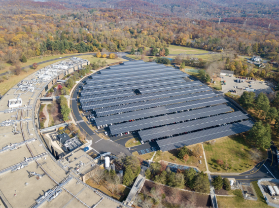 IBM Watson Research Center viewed from the sky. Built in the 1960s, this building has hardly changed in appearance except for the addition of solar panels in the parking lot, but futuristic research such as AI and quantum computing has been continuously advancing here. IBM