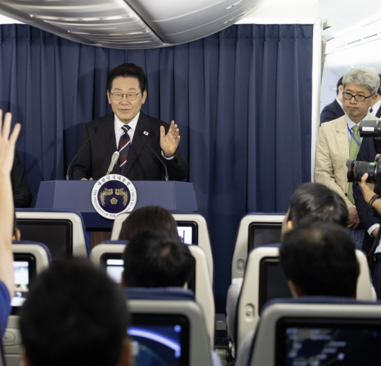 Sangho Kim, Press Support Secretary of the Presidential Office (right), is watching President Jae-myung Lee's press briefing on the flight between Tokyo and Washington on the 24th of last month. Photo by Presidential Office