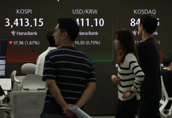 On September 26, as the KOSPI fell by nearly 2% and the won-dollar exchange rate rose by more than 10 won, monitors in the Hana Bank dealing room in Jung-gu, Seoul displayed figures for the KOSPI and the won-dollar exchange rate. On this day, the KOSPI opened at 3,440.39, down 0.89% from the previous session; the KOSDAQ index started at 847.67, down 0.56%; and the won-dollar exchange rate began at 1,409.0 won, up 8.4 won.