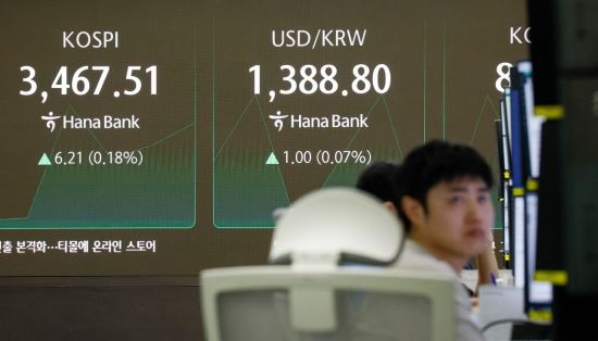 On the 19th, the KOSPI index opened at 3461.23, down 0.07 points from the previous trading day, as dealers worked in the dealing room at the Hana Bank headquarters in Jung-gu, Seoul. On the same day, the KOSDAQ index started trading at 858.08, up 0.97 points from the previous trading day. Photo by Kang Jinhyung, September 19, 2025.