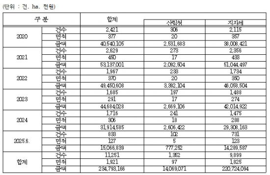 The estimated amount of damage caused by illegal land use in forest areas is 234.7 billion won. In addition to economic losses, the scale of damage could be even greater when considering environmental and social aspects, such as the loss of public functions of forests and increased risk of disasters.