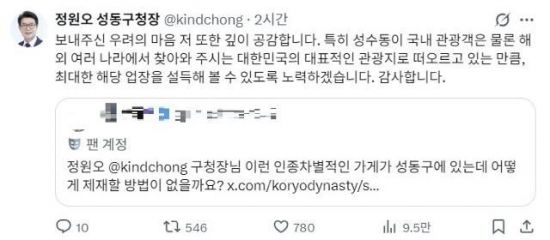 This statement was in response to a question from a user who asked, "Is there really no way to sanction such a racially discriminatory business in Seongdong District?" Mayor Jung said, "I deeply empathize with your concerns," and shared his position accordingly.