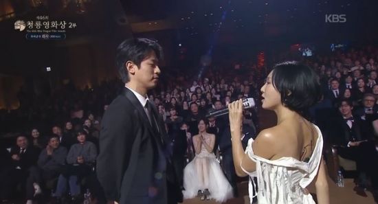 On the 19th, actor Park Jungmin (left) stood on the congratulatory performance stage with singer Hwasa at the Blue Dragon Film Awards ceremony. Screenshot from KBS broadcast