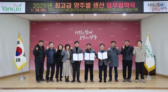 On January 29, Yangju City held a three-party business agreement signing ceremony at the Agricultural Technology Center, attended by around 10 representatives, including Songju Lee, Director of the Yangju Agricultural Technology Center, Sungju Kim, Director of the Yangju United Agricultural Cooperative Rice Processing Complex, and Sungho Cho, President of the Yangju Rice Research Association, to promote the "Production and Quality Advancement of Premium Yangju Rice in 2026."