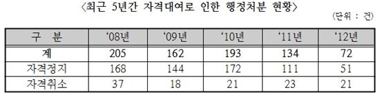 (자료 : 고용노동부)고용노동부에 따르면 지난해 적발된 국가기술자격증 불법대여 건수는 72건으로 이 중 51건은 자격정지, 21건은 자격취소 처분을 받았다. 2008년 205건, 2009년 162건, 2010년 193건, 2011년 134건에 비하면 절반 가까이 줄어든 수치지만 고용부는 "대여행위자체가 줄었다고 보기엔 어렵다"고 설명했다.