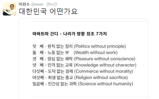 사진=이외수 트위터 캡처[아시아경제 한동우 인턴기자] 소설가 이외수(70)씨가 자신의 트위터에 마하트마 간디의 '나라가 망할 징조 7가지'를 "대한민국 어떤가요"라는 글과 함께 올려 논란이 일고 있다.