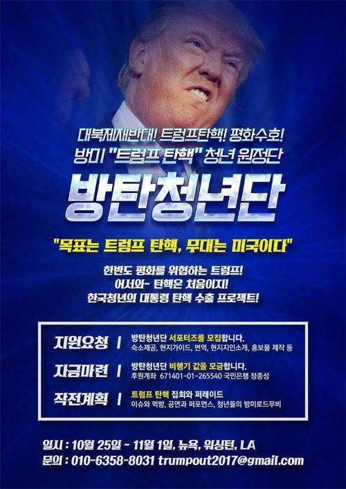 26일 방탄청년단은 오전 자신들의 페이스북에 “트럼프 대통령 탄핵 운동을 위해 먼저 미국으로 출국한 단원 1명이 공항에 억류되어 있다”고 밝히며 화제를 모았다. 이로 인해 방탄청년단은 이날 종일 인터넷 포털사이트 실시간 검색어를 장악했다.