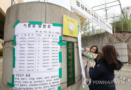 한편 포항 지진으로 포항 시험지구 수험생 6098명 중 북구 4개 시험장에 배정됐던 2045명은 남구 대체 시험장에서 옮겨 수능을 치른다. 포항 수험생들은 입실시간 전 강한 여진이 발생하면 인근 지역의 예비 시험장으로 이동한다.