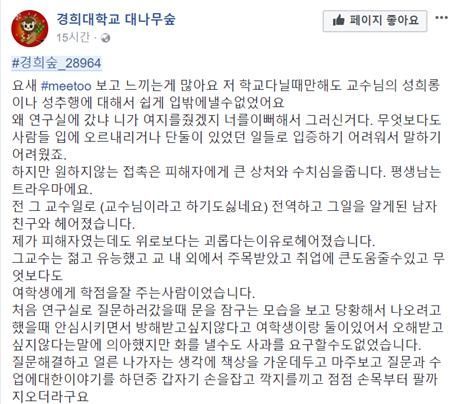 실제로 피해자들은 성폭력을 당하고도 외부 시선이 두려워 쉽게 폭로하지 못해 왔다고 폭로하고 있다. 2월27일 경희대학교 대나무숲에 교수의 성추행 사실을 폭로한 제보자는 “난 피해자인데도 죄 지은 사람처럼 살아왔다”면서 “성관련 피해자들이 왜 적극적인 대응을 하지 못하고 사회의 시선으로부터 부끄럽고 더 수치스러웠는지 알 것 같았다”고 고백하기도 했다.