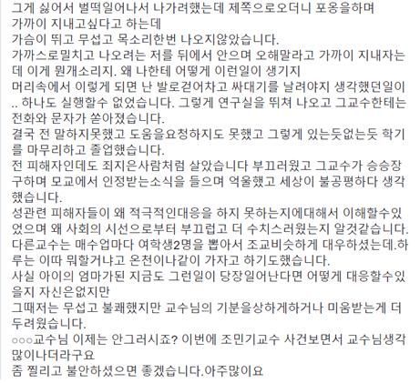 이 같은 상황에 대해 남정숙 전 성균관대 대우전임교수는 “대학을 비롯한 교육계 내에서의 은밀한 성폭력은 굉장히 빈번한 일”이라며 “이런 곳일수록 피해자를 보호할 수 있는 독립적인 기구를 마련할 필요가 있다”고 지적했다.