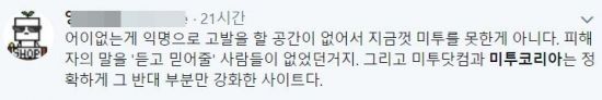 네티즌들이 미투 제보 사이트를 비판하고 있다. (사진=트위터 화면 캡처)네티즌은 두 사이트를 강하게 비판하며 연일 사이트 폐쇄를 주장하고 있다. "폭로 내용 경쟁을 시키는 것인가? 성폭력 피해를 스포츠로 즐기는 것인가?" "남의 슬픔을 맘대로 판단하고 소비하는 것이 2차 가해인데 두 사이트의 행태가 그렇다. 사이트 폐쇄만이 답이다" 등의 지적이 이어지고 있다.