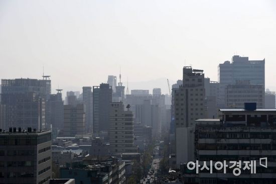 중국발 황사의 영향으로 수도권과 강원도 지역에서 미세먼지 농도가 '나쁨~매우 나쁨' 수준을 보인 11일 서울 도심 하늘이 뿌연 모습을 보이고 있다. /문호남 기자 munonam@[아시아경제 김보경 기자] 환경부와 수도권대기환경청은 12일 서울 영등포구 켄싱턴호텔에서 안병옥 환경부 차관 주재로 수도권 내 민간사업장 39곳과 '미세먼지 비상저감조치 참여 자발적 협약식'을 개최한다.