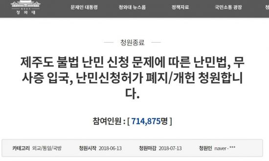 앞서 청와대는 1일 '난민 수용 반대' 국민청원에 대해 허위 난민의 입국을 막기 위해 심사를 강화하겠다고 밝혔다. 박상기 법무부 장관은 "난민 신청 시 소셜네트워크서비스(SNS) 계정 제출을 의무화하는 등 신원 검증을 강화할 것"이라며 "불법 행위를 조장하는 난민 브로커 처벌 조항도 명문화할 계획"이라고 말했다.