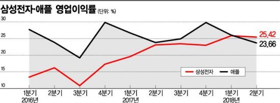 2일 업계에 따르면 애플은 2분기 매출 533억 달러(약 59조 6000억원), 영업이익 126억1200만 달러(약 14조 1300억원)를 기록했다. 영업이익률은 23.7%다. 삼성전자가 지난달 31일 공개한 2분기 영업이익률은 25.42%로 1.72%p차이로 애플을 앞섰다. 삼성전자의 2분기 매출액과 영업이익은 각각 58조 4800억원, 14조 8700억원이다.