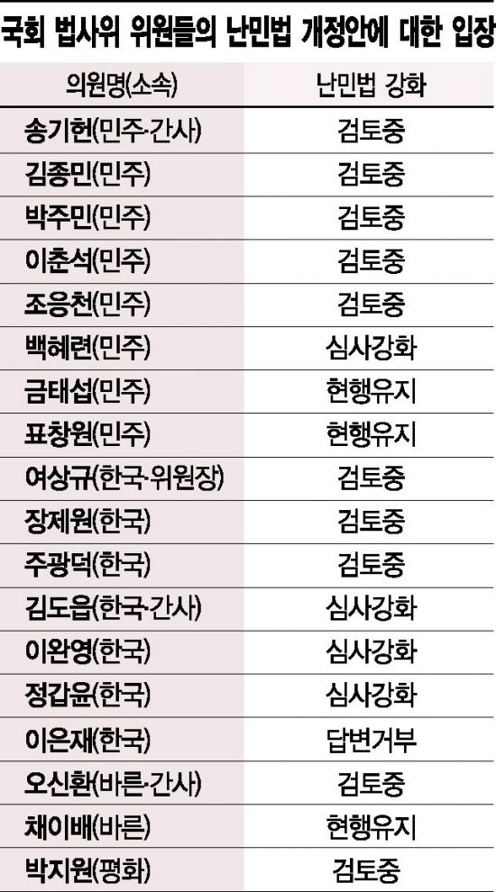 2일 아시아경제가 국회 후반기 법사위 위원 18명을 전수조사한 결과 기존 난민법을 강화하는 취지의 난민법 개정안에 10명이 '유보' 입장을 표명했다. 3명은 '현행유지' 입장을 내비쳤고, 4명은 '심사강화' 입장을 밝혔다. 1명은 답변을 거부했다. 유보 입장을 낸 의원의 다수는 "신중하게 검토하는 중"이라고 답했다.