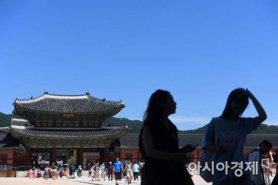 폭염의 기세가 한풀 꺾이며 내륙의 폭염특보가 대부분 완화된 17일 서울 종로구 경복궁이 관광객들로 북적이고 있다. /문호남 기자 munonam@[아시아경제 안하늘 기자] 일요일인 19일 전국이 대체로 맑은 가운데 아침·저녁으로는 비교적 선선한 날씨를 보이겠다.