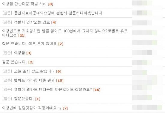 다른 회원들은 음란물로 인해 경찰에 붙잡힐까 두려움을 호소했다. 한 회원은 “‘누나샤워’ 등 몰카 영상물을 토렌트 사이트에서 일주일 전에 다운 받았는데 조마조마하다”고 적었다. 이에 다른 회원들은 “한국에선 야동을 보면 다 범죄자 취급을 한다. 절에 들어가는 방법 밖에 없다”고 댓글을 달기도 했다. 이 외에도 수많은 회원들이 ‘아청물(아동청소년 음란물의 줄임말)을 다운 받았는데 단속대상이냐’ ‘웹하드에서 단속에 걸려 사라졌던 리벤지 포르노가 다시 올라왔는데 지금 다운 받으면 위험하냐’ 등의 질문을 남겼다.