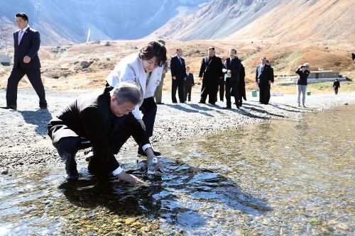 문재인 대통령 부인 김정숙 여사가 20일 오전 김정은 국무위원장 내외와 백두산 천지를 산책하던 중 천지 물을 물병에 담고 있다. 2018.9.20 /평양사진공동취재단제주 한라산에서 생산된 생수 브랜드 ‘삼다수’도 광고효과를 톡톡히 누렸다. 문 대통령과 김정숙 여사는 천지에서 미리 준비해온 삼다수 병을 꺼내 물을 붓고,