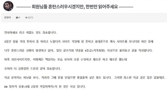 회원 4만명 이름·아이디·메일주소 털려해커, 회원명단 온라인에 게시하며 논란아이디 삭제 위해 접속자 몰린 사이트 결국 폐쇄'유흥탐정' 논란과 비슷한 양상 30일, 해킹을 당한 성인사이트 운영자가 데이터 베이스(DB)가 일부 유출된 것이 사실이라며 공지사항을 올렸다. (사진=홈페이지 캡처)[아시아경제 이승진 기자] 국내의 한 성인사이트가 해킹을 당해 회원 4만 여 명의 개인정보가 유출됐다. 해커가 자신이 빼돌린 회원 명단을 온라인에 게시하며 논란이 커지고 있다.