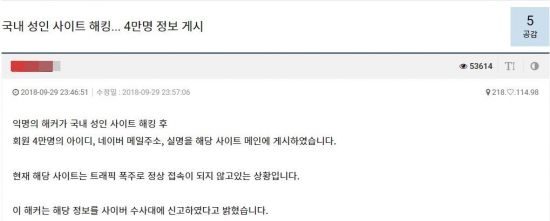 성인사이트 해킹에 회원 4만명 개인정보 유출