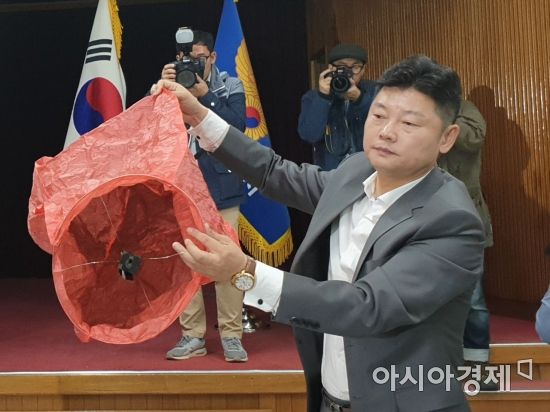 9일 오전 10시 경기 고양경찰서에서 열린 대한송유관공사 경인지사 저유소 화재사건 관련 브리핑에서 경찰 관계자가 사고 발생 당시와 같은 종류의 풍등을 들어보이고 있다. 유병돈 기자 A씨는 앞서 지난 6일 오후 인근 초등학교에서 진행된 캠핑 행사에서 날아온 풍등을 주워 날린 것으로 조사됐다.
