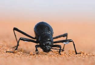 아프리카 나미비아의 사막에 사는 딱정벌레 '스테노카라'의 모습. [사진=피어슨(글로벌 에디션 2015)]포그캐처는 아프리카 나미비아의 사막에 사는 딱정벌레 '스테노카라'가 물을 얻는 방법을 응용해 만든 장치입니다. 스테노카라는 비 한 방울 구경하기 힘든 나미비아의 사막에서 물 걱정없이 잘 살고 있습니다. 스테노카라의 등에는 1㎜ 간격의 돌기가 촘촘하게 자리잡고 있는데 이 돌기의 끝은 친수성, 바닥면은 물과 친하지 않은 혐수성 성분으로 구성돼 있지요.