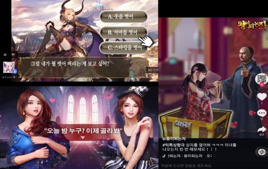 왼쪽 위 부터 시계방향 순서대로 데일리판타지, 왕이되는자, 상류사회의 광고 장면.[아시아경제 이민우 기자] “그럼 내가 뭘 벗어버리는 게 보고 싶어? A, 옷을 벗어. B, 치마를 벗어. C, 스타킹을 벗어.”
