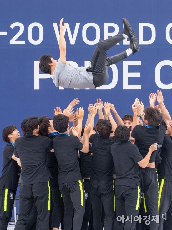 정정용 U-20 청소년대표팀 감독이 17일 서울광장에서 열린 'U-20 월드컵 대표팀 환영행사'에 참석해 선수들에게 헹가래 받고 있다./강진형 기자aymsdream@[아시아경제 김흥순 기자, 손선희 기자] 한국 남자축구 사상 최초로 국제축구연맹(FIFA) 주관대회 결승진출과 준우승을 달성한 20세 이하(U-20) 축구대표팀이 금의환향했다. 19일에는 문재인 대통령과 청와대에서 만찬을 갖는다.
