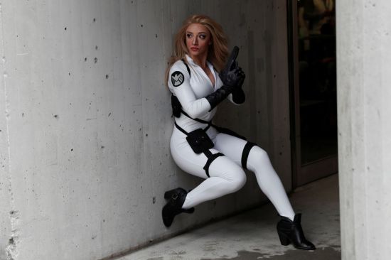 3일(현지시간) 미국 뉴욕 맨하탄에서 열린 '2019년 뉴욕 코믹콘(2019 New York Comic Con)'에서 쉴드 요원 샤론카터의 코스츔 의상을 입은 참가자가 포즈를 취하고 있다.