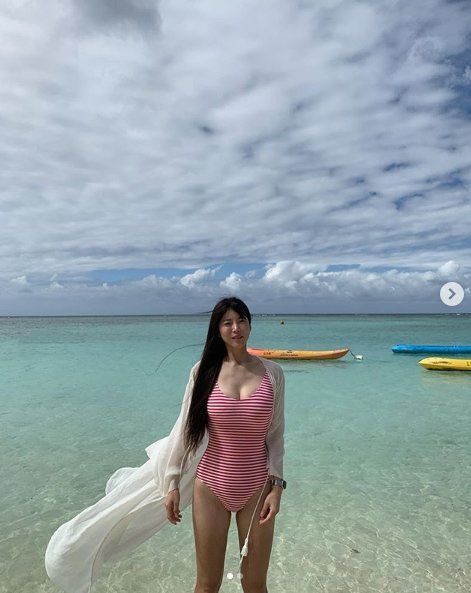 공개된 사진 속 정현우는 수영복을 입고 한 바닷가에서 포즈를 취하고 있다.