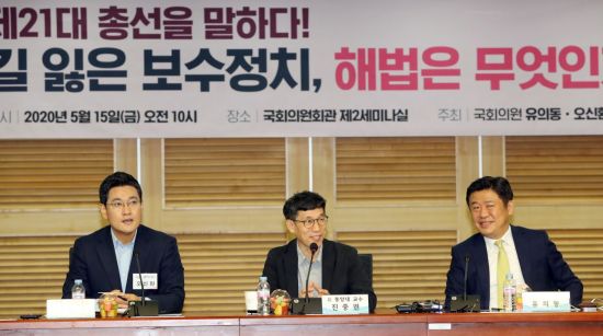 15일 오전 서울 여의도 국회 의원회관에서 열린 '제21대 총선을 말하다! 길 잃은 보수정치, 해법은 무엇인가?' 토론회에 미래통합당 유의동·오신환 의원, 진중권 전 동양대 교수가 참석해 있다. [이미지출처=연합뉴스]황교안 전 통합당 대표에 대해서는 "당대표가 황교안씨였다. 이것도 딱 보면 탄핵의 강을 못 건넌 것"이라며 "이 분이 탄핵 총리다"라면서 "탄핵 정권 패전투수를 당대표 시킨 것은 탄핵을 인정하지 못한다는 메시지다. 그러다보니 대안세력으로 인정을 못 받은 것"이라고 말했다.