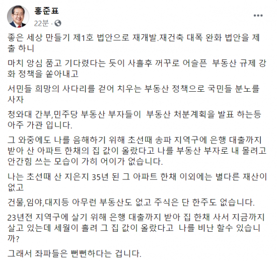 홍 전 대표는 "나는 초선때 산 지은 지 35년 된 그 아파트 한채 이외에는 별다른 재산이 없고 건물, 임야, 대지 등 아무런 부동산도 없고 주식은 단 한주도 없다"며 "23년전 지역구에 살기 위해 은행 대출까지 받아 집 한채 사서 지금까지 살고 있는데 세월이 흘려 그 집 값이 올랐다고 나를 비난할 수 있나"고 말했다.