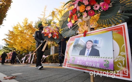 문재인 정부에 반대하고 윤석열 검찰총장을 지지하는 시민단체 ‘자유연대’ 관계자들이 2일 서울 서초구 대검찰청 청사 앞의 화환을 자진 철거하고 있다./김현민 기자 kimhyun81@윤석열 검찰총장은 2022년 3월 무엇을 하고 있을까. 여의도 정가의 시선이 ‘서초동’을 향하고 있다. 특정 정당에 몸담지도 않았고 본인 입으로 정치를 하겠다고 한 적도 없는데 주요 정치인들을 제치고 차기 대선주자 지지율 1위를 기록했다는 소식이 전해졌기 때문이다.
