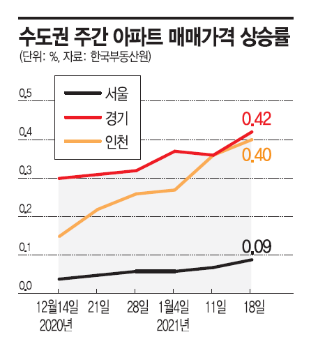 경기도가 0.42% 올라 전주(0.36%) 대비 상승폭이 커졌고 인천 역시 0.36%에서 0.40%로 상승폭을 확대했다. 문재인 대통령이 지난 18일 신년기자회견에서 "예상을 뛰어넘는 특단의 대책"을 내놓겠다고 공언했지만 시장 심리에는 전혀 영향을 미치지 못하고 있는 셈이다. 특히 그동안 집값 상승에서 소외됐던 경기도 양주(1.27%), 고양 덕양(1.10%)의 경우 3주 연속 1%가 넘는 상승률을 기록하며 집값 과열 조짐까지 나타나고 있다.