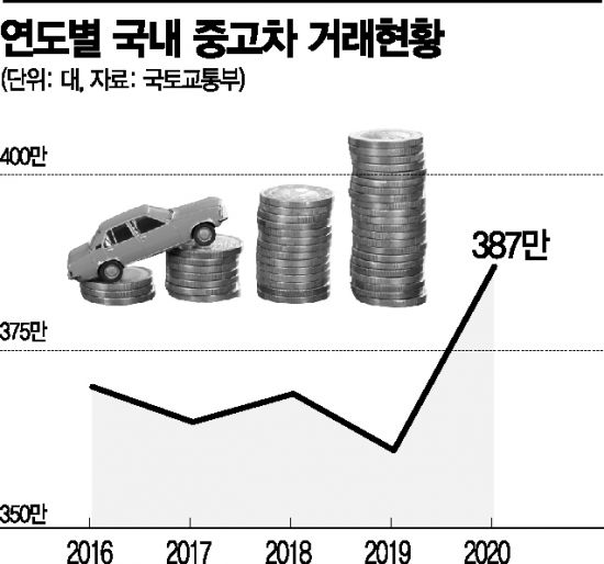 5일 국토교통부에 따르면 지난해 국내에서 거래된 중고차 수는 역대 최대인 387만대로 전년 대비 7.2% 증가했다. 중고차 거래시장이 2010년 이후 매년 성장하고 있다는 점을 감안한다면 올해 400만대 돌파가 확실시되고 있다. 지난해 신규로 등록된 자동차가 191만대였다는 점을 감안할 때 국내 중고차시장은 신차시장에 비해 2배 이상 커졌다는 분석이다.