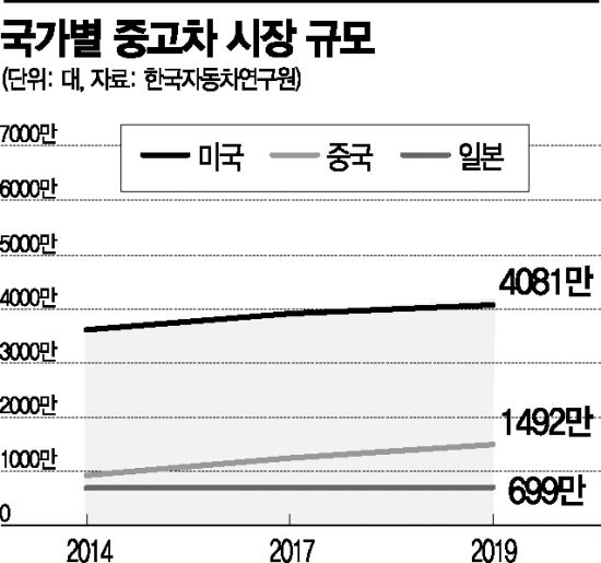 중고차시장이 커지는 것은 우리나라뿐 아니라 주요 국가에서도 비슷하게 발생하고 있다. 미국은 2014년 중고차시장 규모가 3624만대에서 2019년 4081만대로 늘었고 같은 기간 중국은 920만대에서 1492만대로 증가했다.